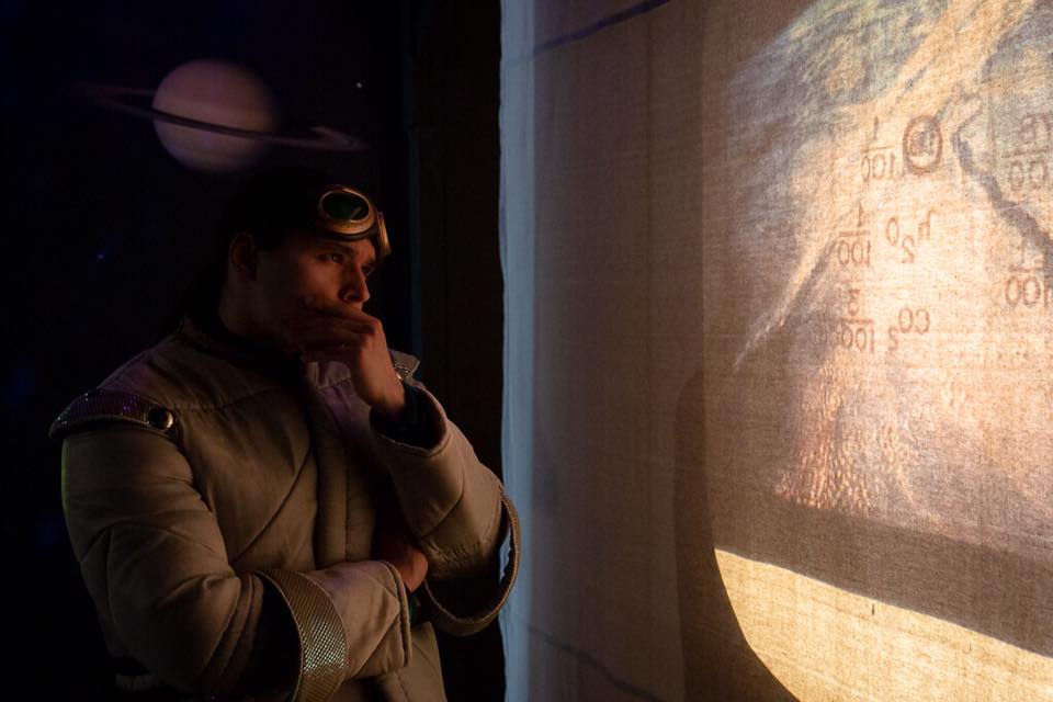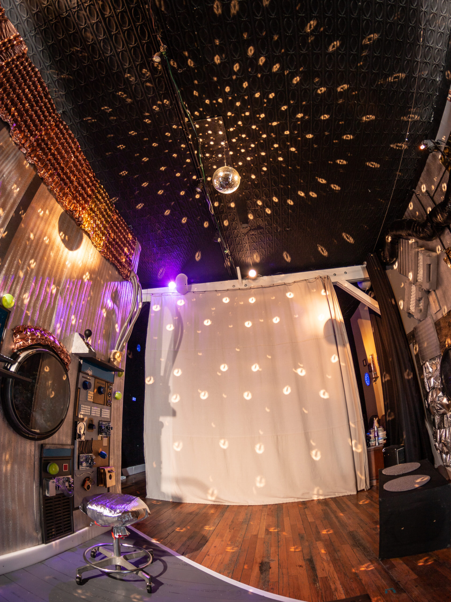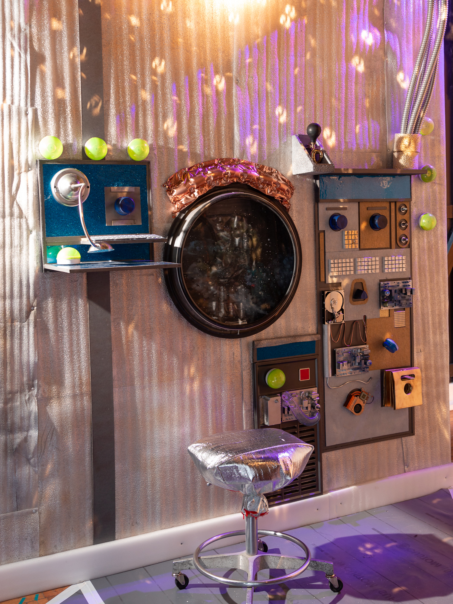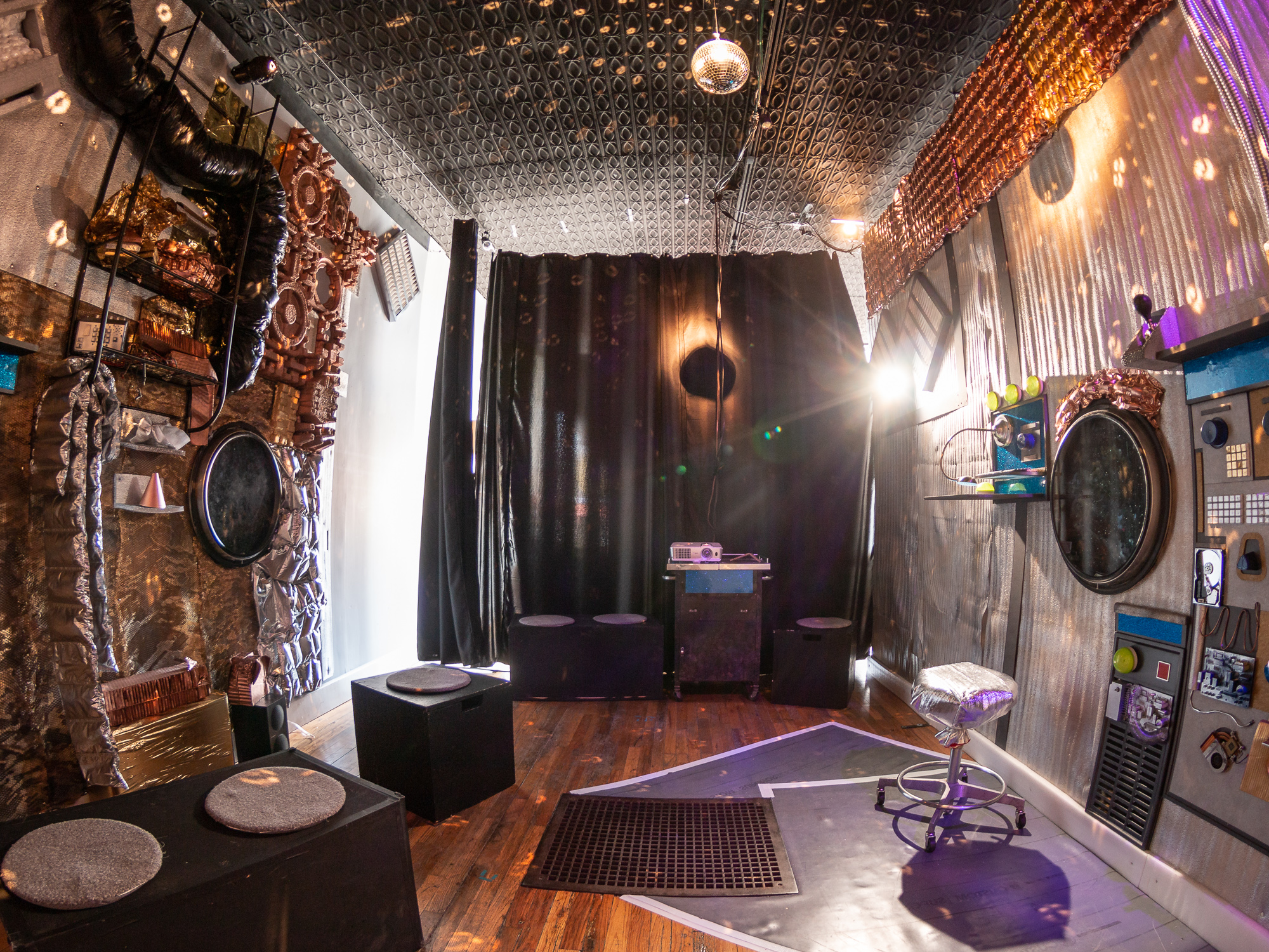 Set design made from found objects and dumpster trash. Materials intended to take up space in shipping becomes "space junk".